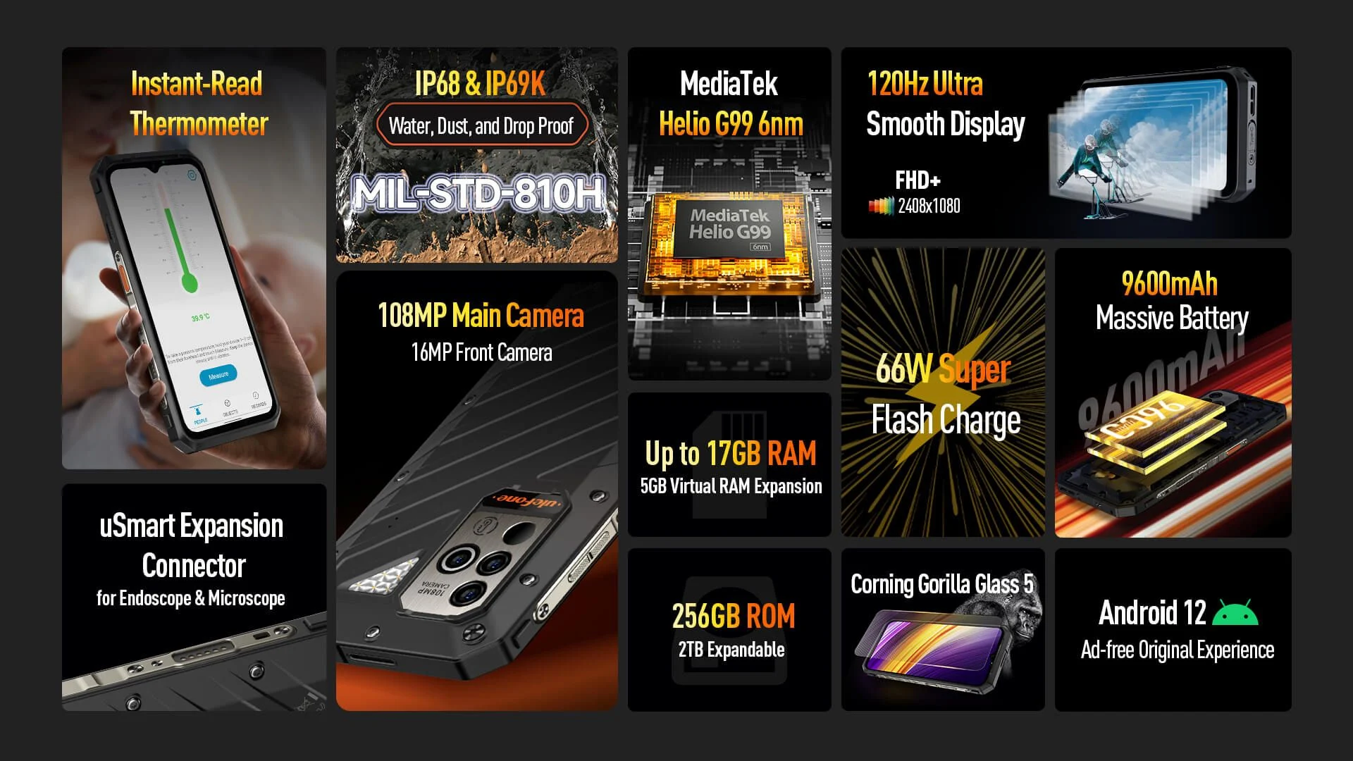 The Ulefone Power Armor 19 is a rugged smartphone designed for durability and performance, featuring a stunning 6.58″ FHD+ screen and a powerful 9,600mAh battery.