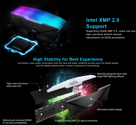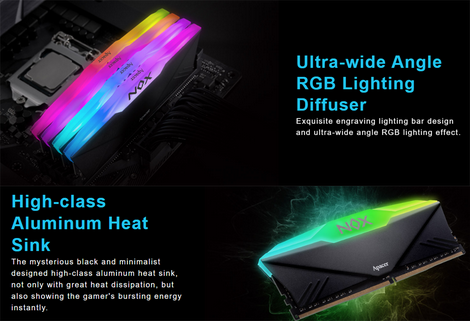 The Apacer Nox 16GB RGB DDR4 3600MHz Gaming Memory is designed for gamers seeking both performance and style. With its remarkable tested speed of 3600MHz and supported Intel XMP 2.0 for easy overclocking, it ensures enhanced gaming performance. The memory is elegantly wrapped in matte black, textured, aluminum heat spreaders that improve thermal management. The unique design features angled spreaders and ribs that draw attention to the Apacer branding.