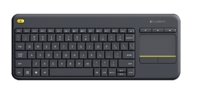 The Logitech K400+ Wireless Touch Keyboard allows you to navigate your PC-to-TV entertainment seamlessly with its built-in touchpad and wireless convenience.